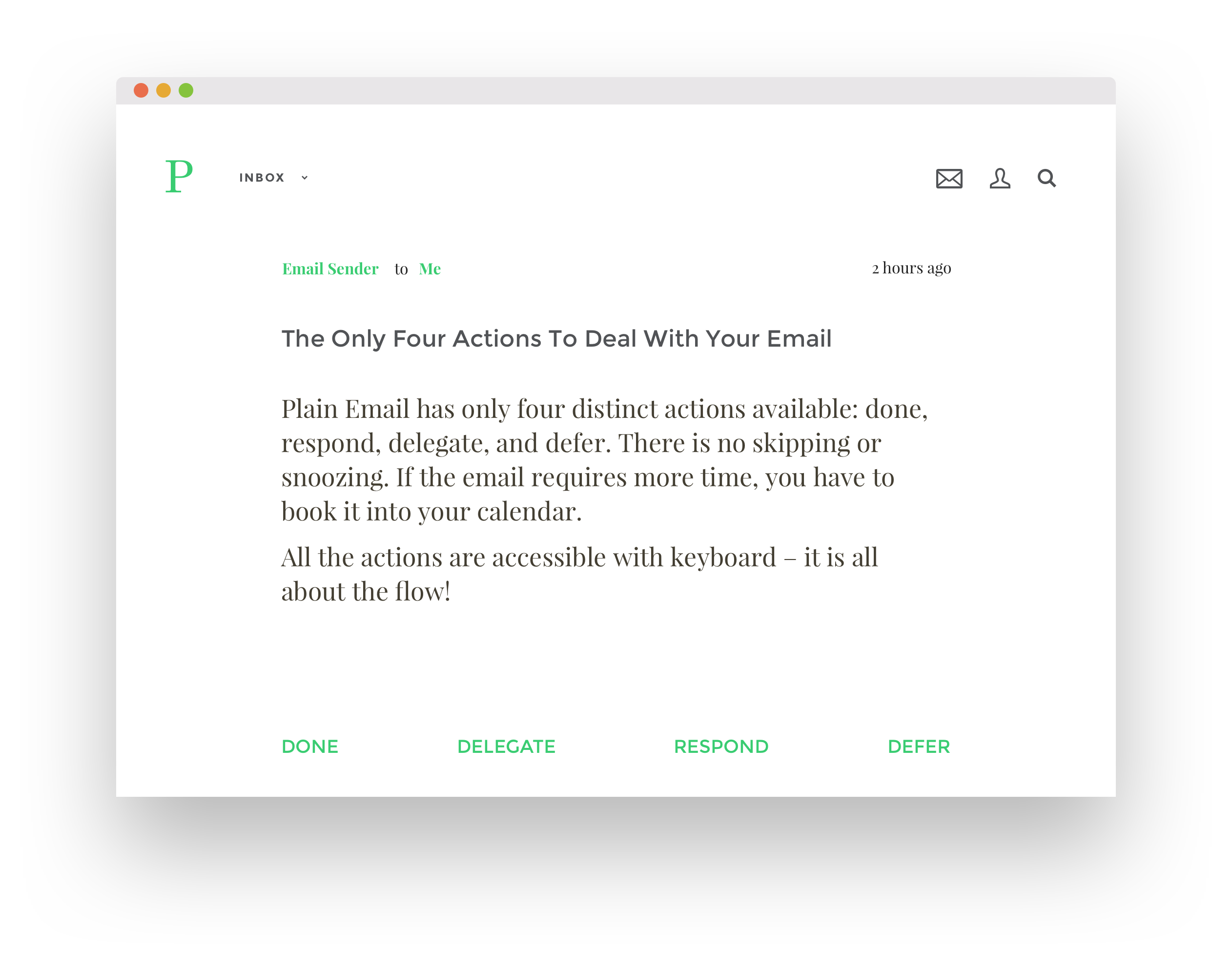 Plain Email stays true to GTD® methodology with only four distinct actions available: done, respond, delegate, and defer. There is no skipping or snoozing. If the email requires more time, you have to book it into your calendar. All the actions are accessible with keyboard – it is all about the flow!